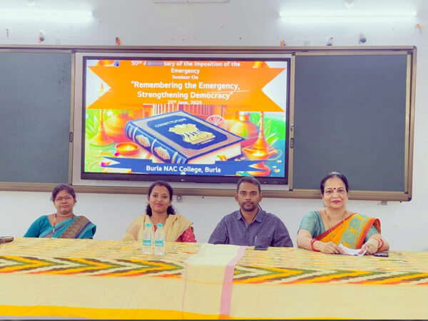 On the occasion of the 50th anniversary of the imposition of Emergency, a seminar was organized at Burla NAC College, Burla on the theme “Remembering the Emergency, Strengthening the Democracy.”